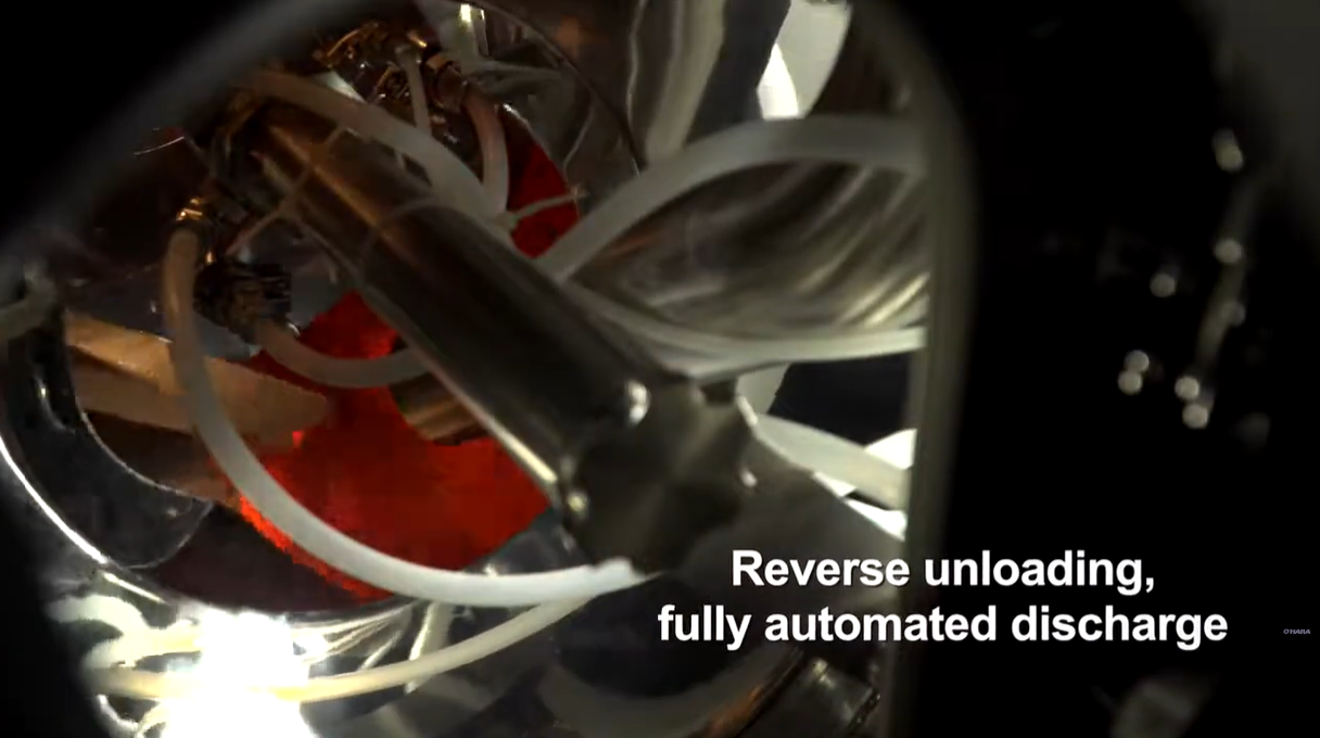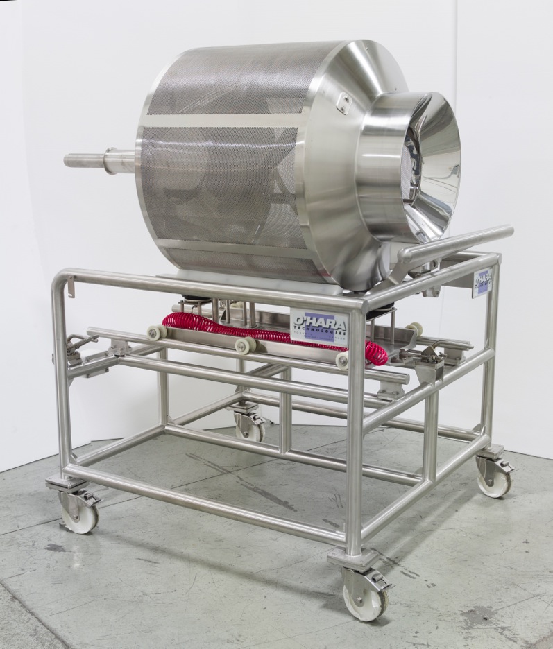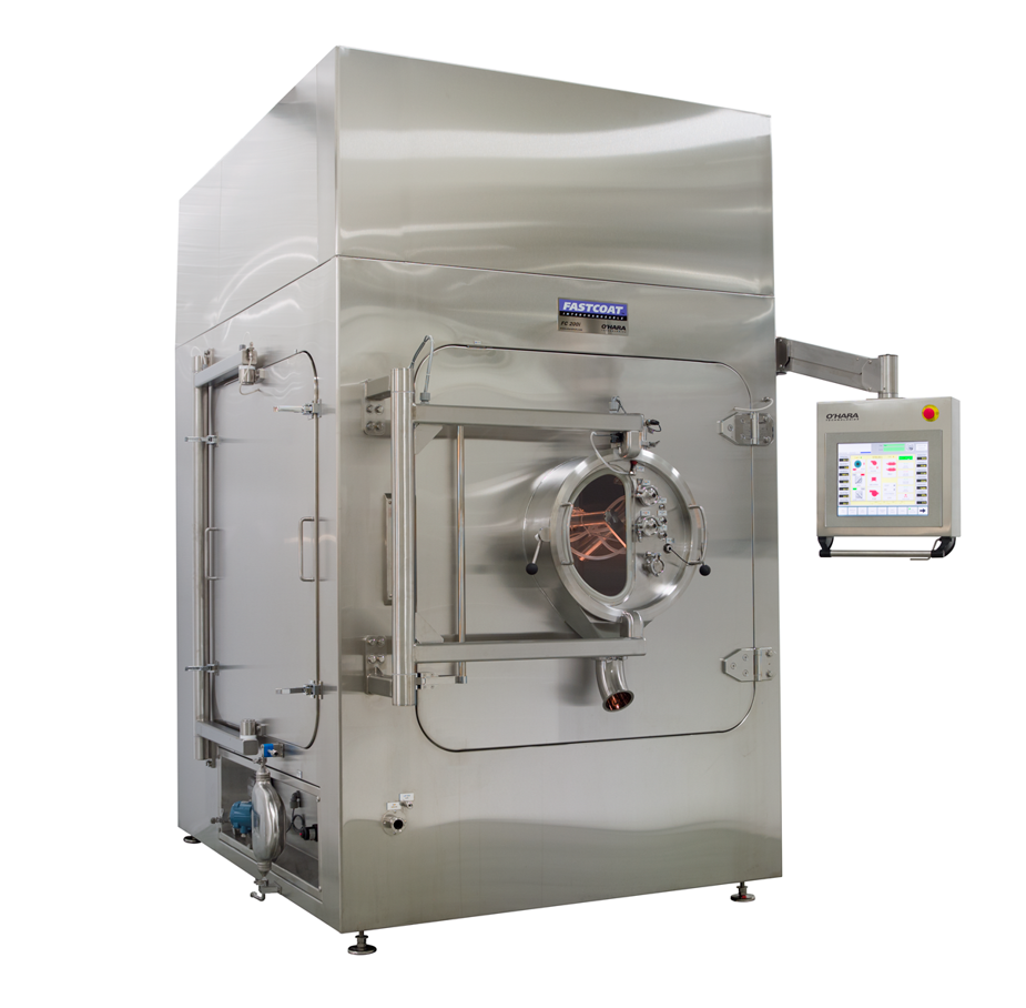Our Fastcoat™ Interchangeable tablet coating systems are designed to supply a quick and reliable solution to your production requirements. Supplied with a remote air handling unit with dehumidification and HEPA filtration as standard. Additional features such as pre-heat and humidification are also available to provide an optimal coating environment, year-round. Anti-bearding spray nozzles are supplied on our O’Hara Professional Coating Arm (PCA), which is a block-style manifold with built-in tubing for liquid and compressed air to allow for a sleek and organized appearance. Upon completion of each batch, tablets are unloaded automatically with our reverse unloading system.