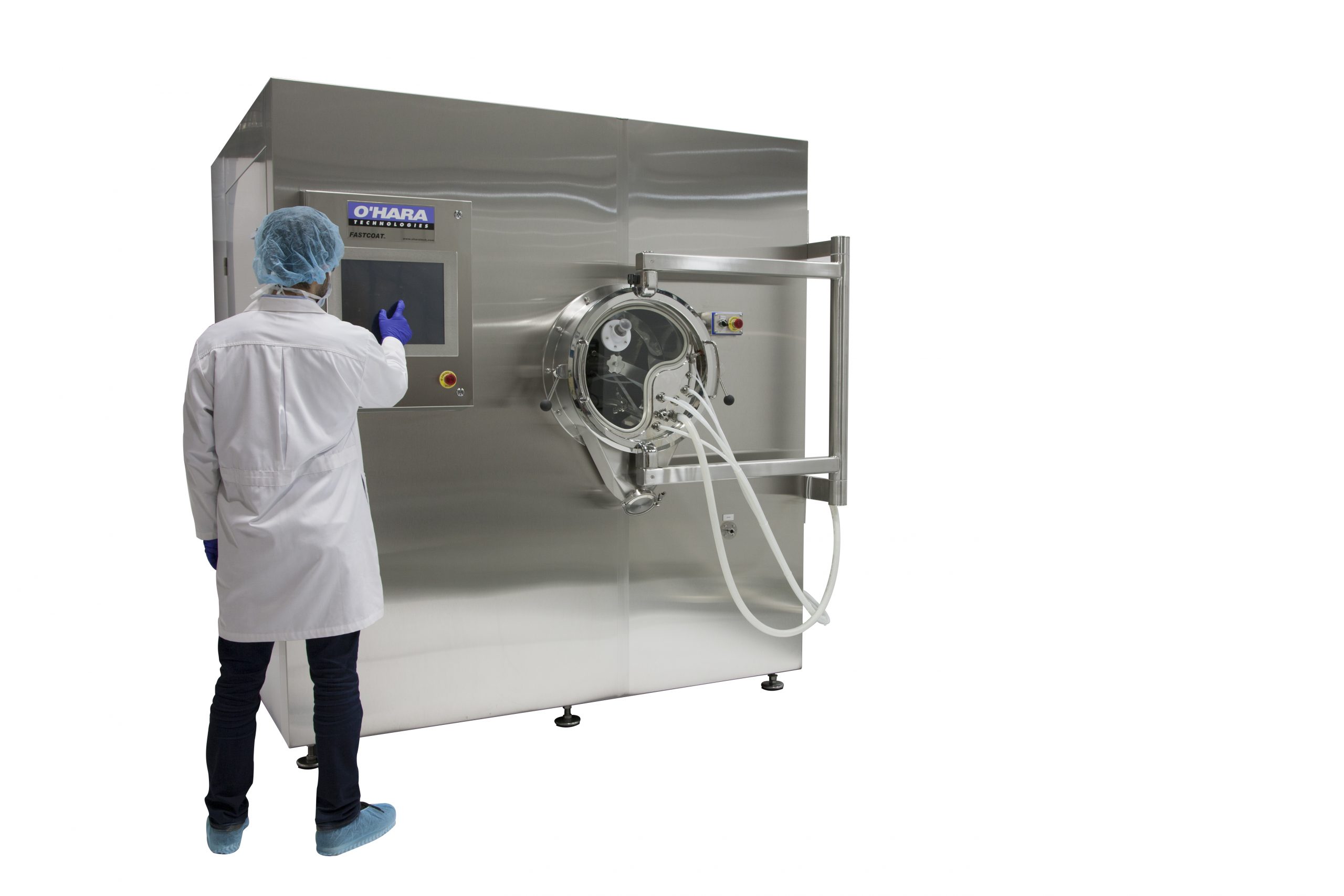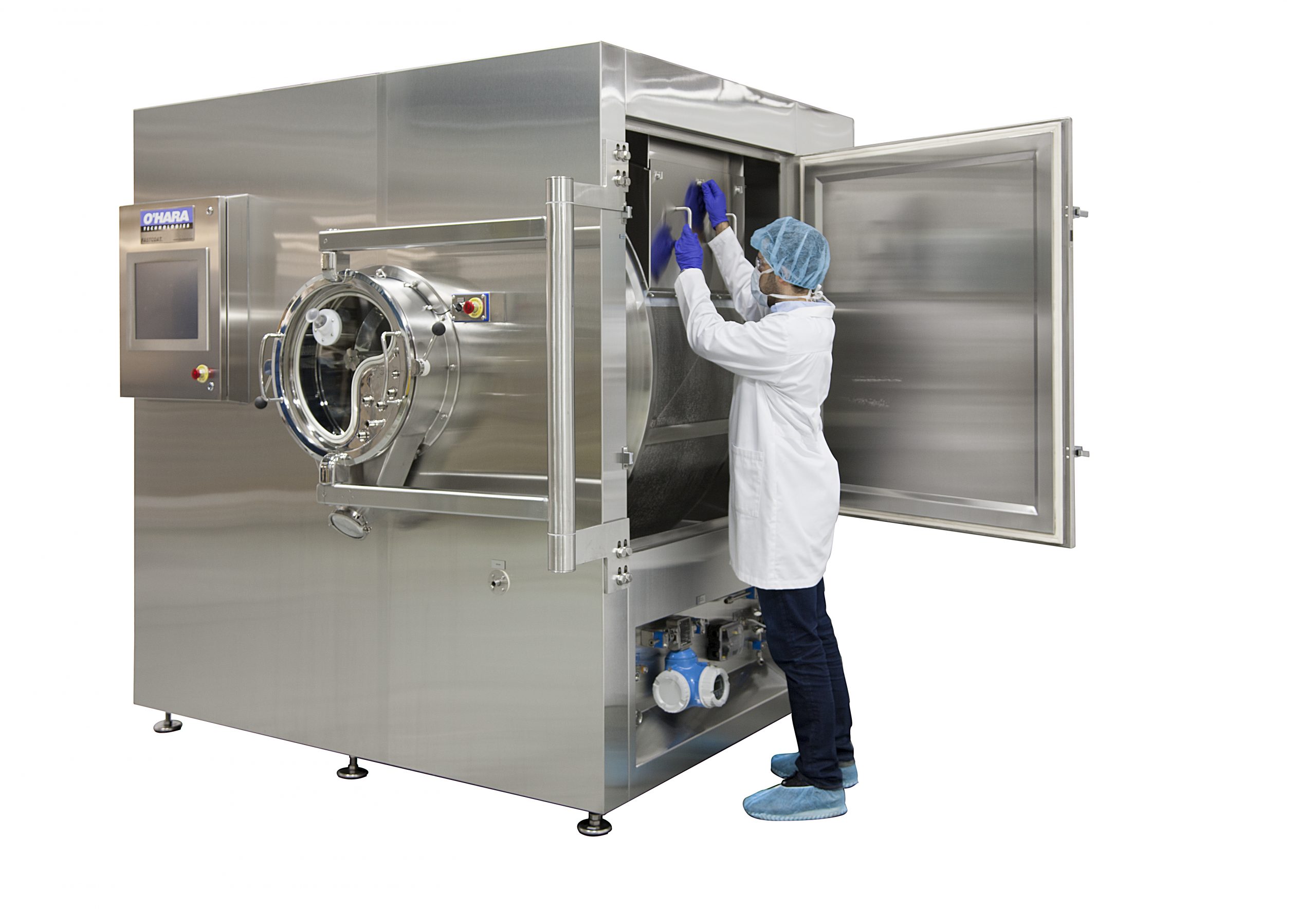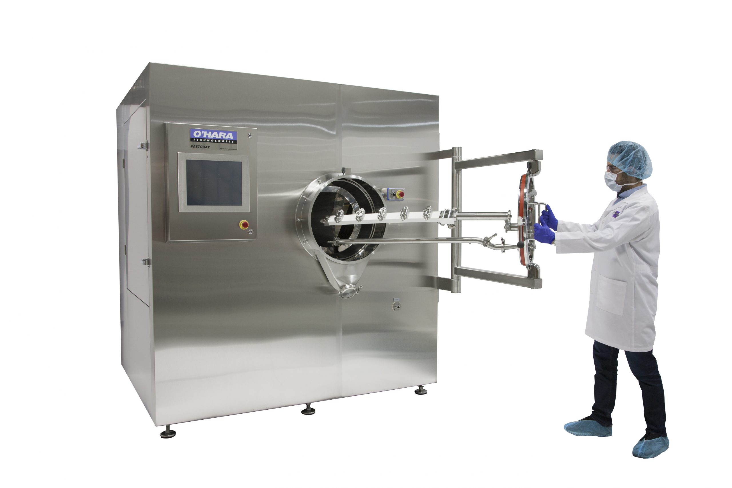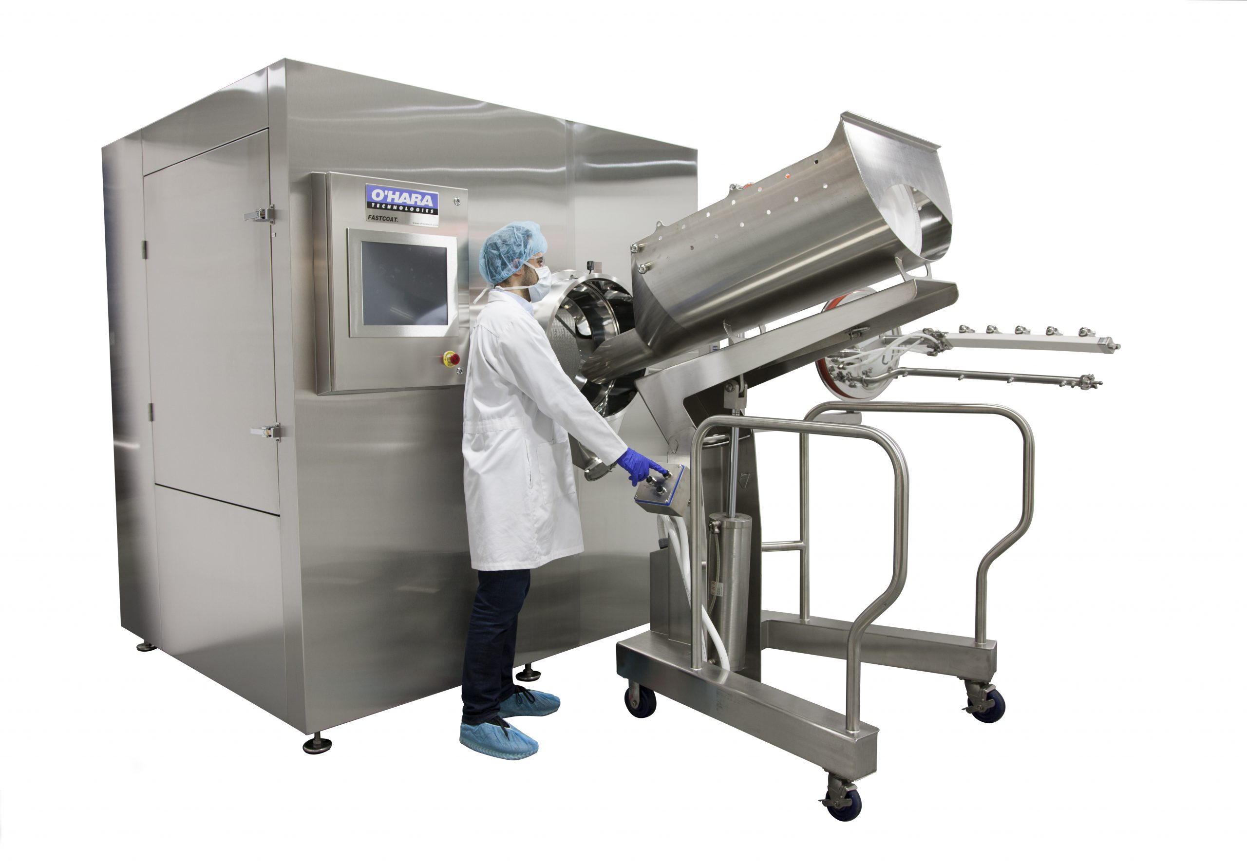 Our Fastcoat™ fixed-pan tablet coating systems are designed to supply a quick and reliable solution to your production requirements. Supplied with a remote air handling unit with dehumidification and HEPA filtration as standard. Additional features such as pre-heat and humidification are also available to provide an optimal coating environment, year-round. Anti-bearding spray nozzles are supplied on our O’Hara Professional Coating Arm (PCA), which is a block-style manifold with built-in tubing for liquid and compressed air to allow for a sleek and organized appearance. Upon completion of each batch, tablets are unloaded automatically with our reverse unloading system.